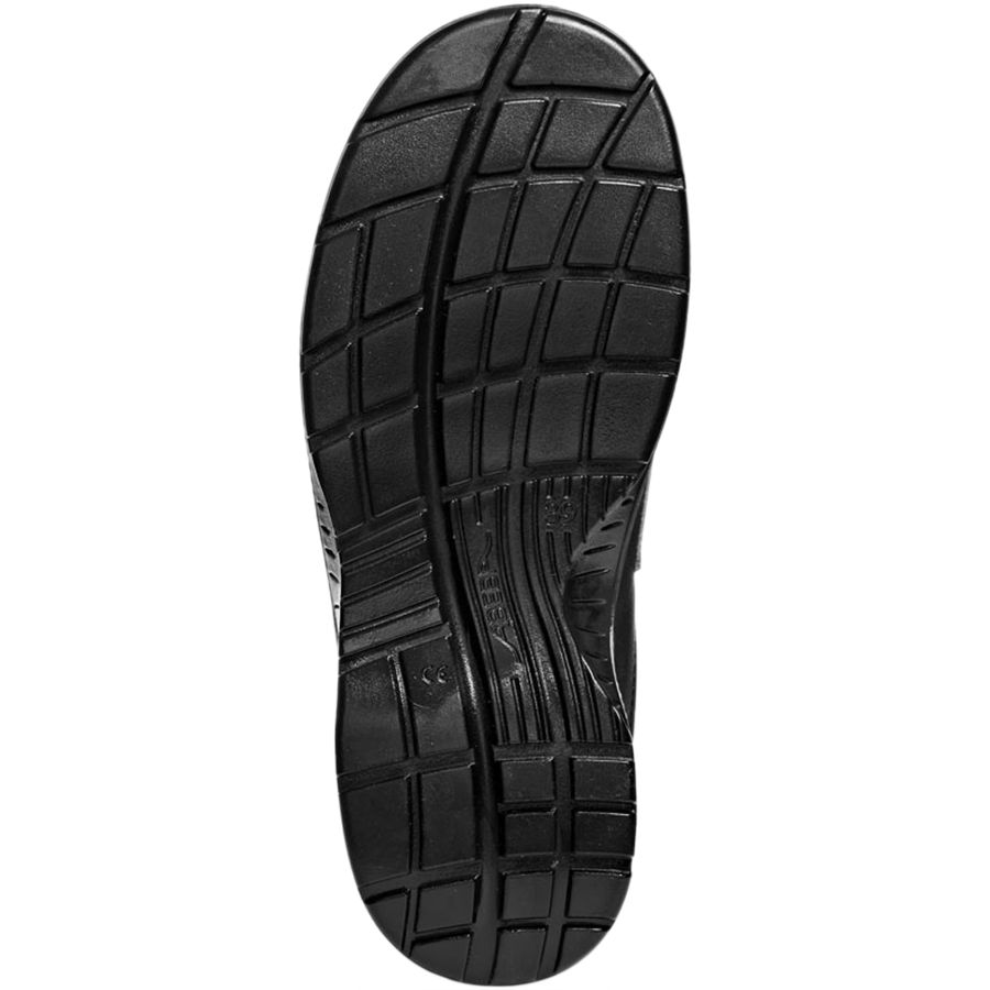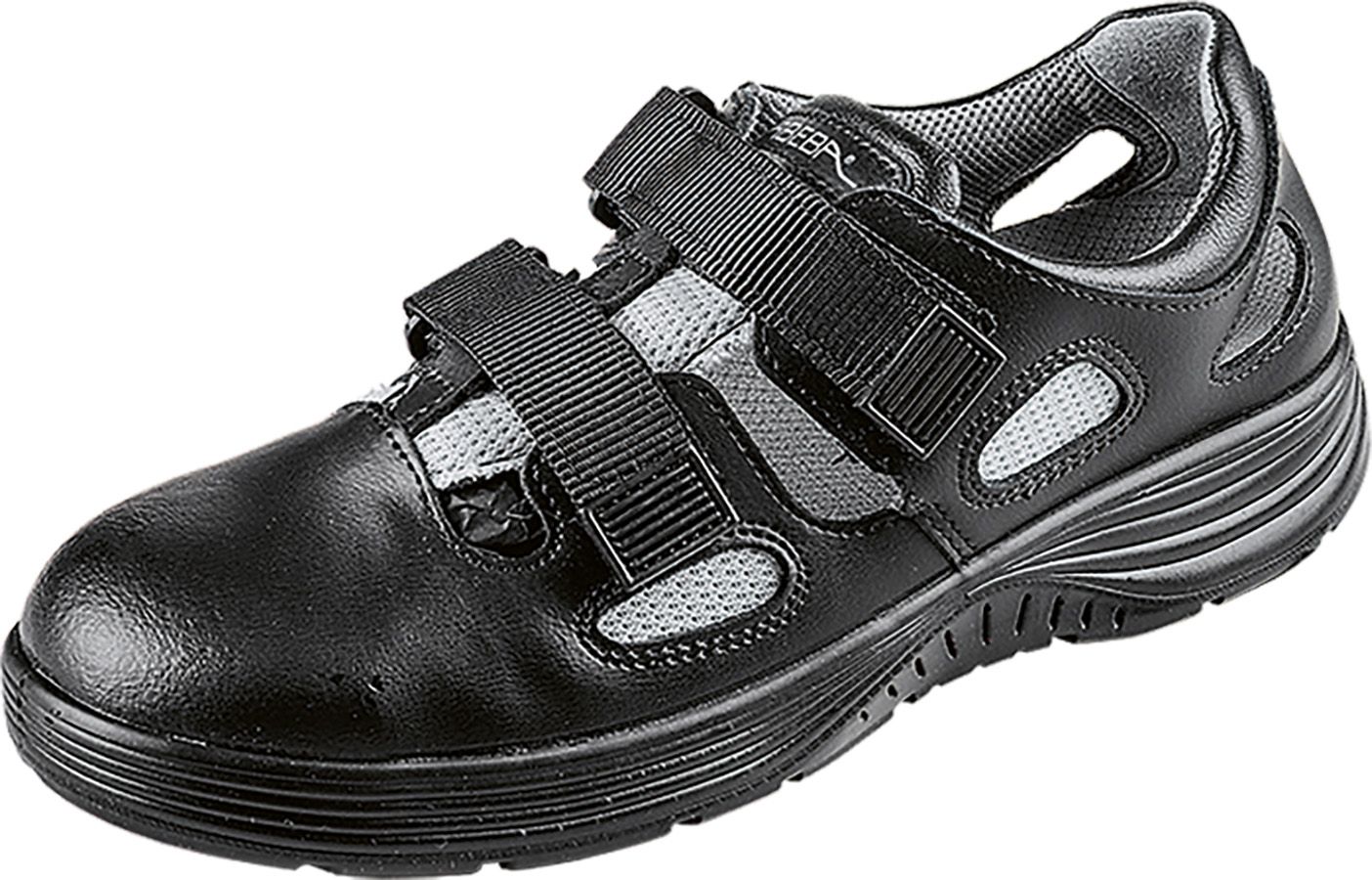 Schaft: Gelochtes, schwarzes Rindsleder, schweissabsorbierendes Spezialfutter, gepolsterter Schaftrand, gepolsterte Lasche, Klettverschluss, Zehenschutz-Stahlkappe.